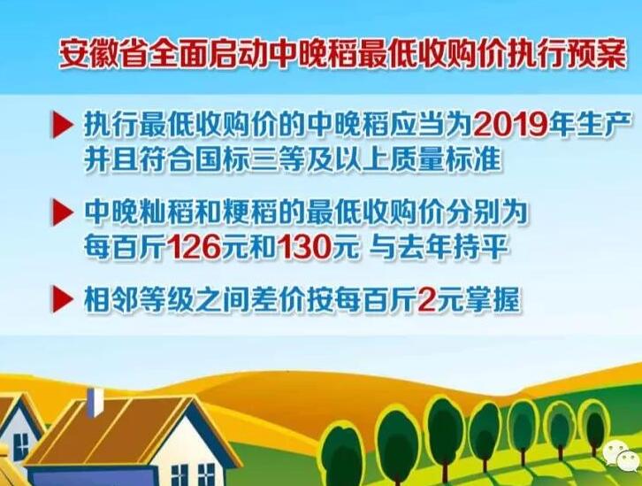 ??? 近日,從省政府新聞辦舉行的新聞發(fā)布會上了解到,從現(xiàn)在開始到2020年1月31號,安徽省全面啟動中晚稻最低收購價執(zhí)行預(yù)案,執(zhí)行最低收購價的中晚稻應(yīng)當(dāng)為2019年生產(chǎn)并且符合國標(biāo)三等及以上質(zhì)量標(biāo)準(zhǔn),中晚秈稻和粳稻的最低收購價分別為每百斤126元和130元,與去年持平,相鄰等級之間差價按每百斤2元掌握。